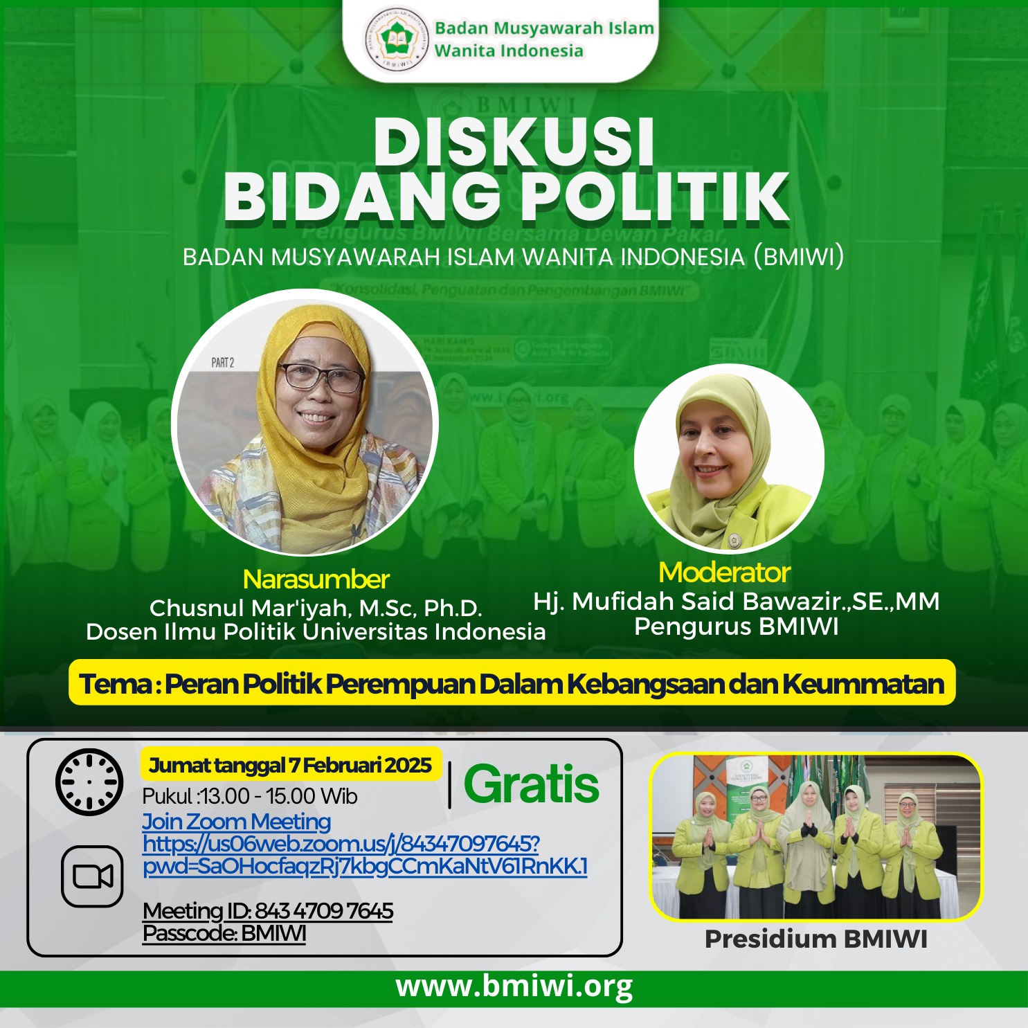 Melalui diskusi ini, BMIWI berharap dapat memberikan pemahaman lebih dalam mengenai pentingnya peran politik perempuan, sekaligus membangun kesadaran kolektif akan perlunya partisipasi perempuan dalam menciptakan kebijakan yang adil, inklusif, dan berbasis pada nilai-nilai Islam yang luhur.*/